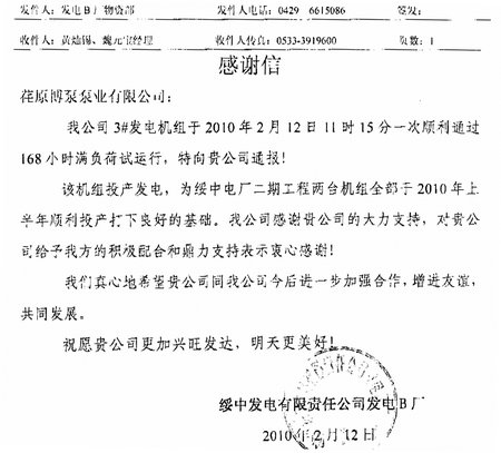 2009年9月27日8時,海門一期4 *1000MW國產(chǎn)臨界機組,#2機圓滿完成了168小時滿負荷運行,順利投產(chǎn)發(fā)電。海門電廠特地為我公司發(fā)來感謝函,對我公司的優(yōu)良服務表示感謝。海門一期4 *1